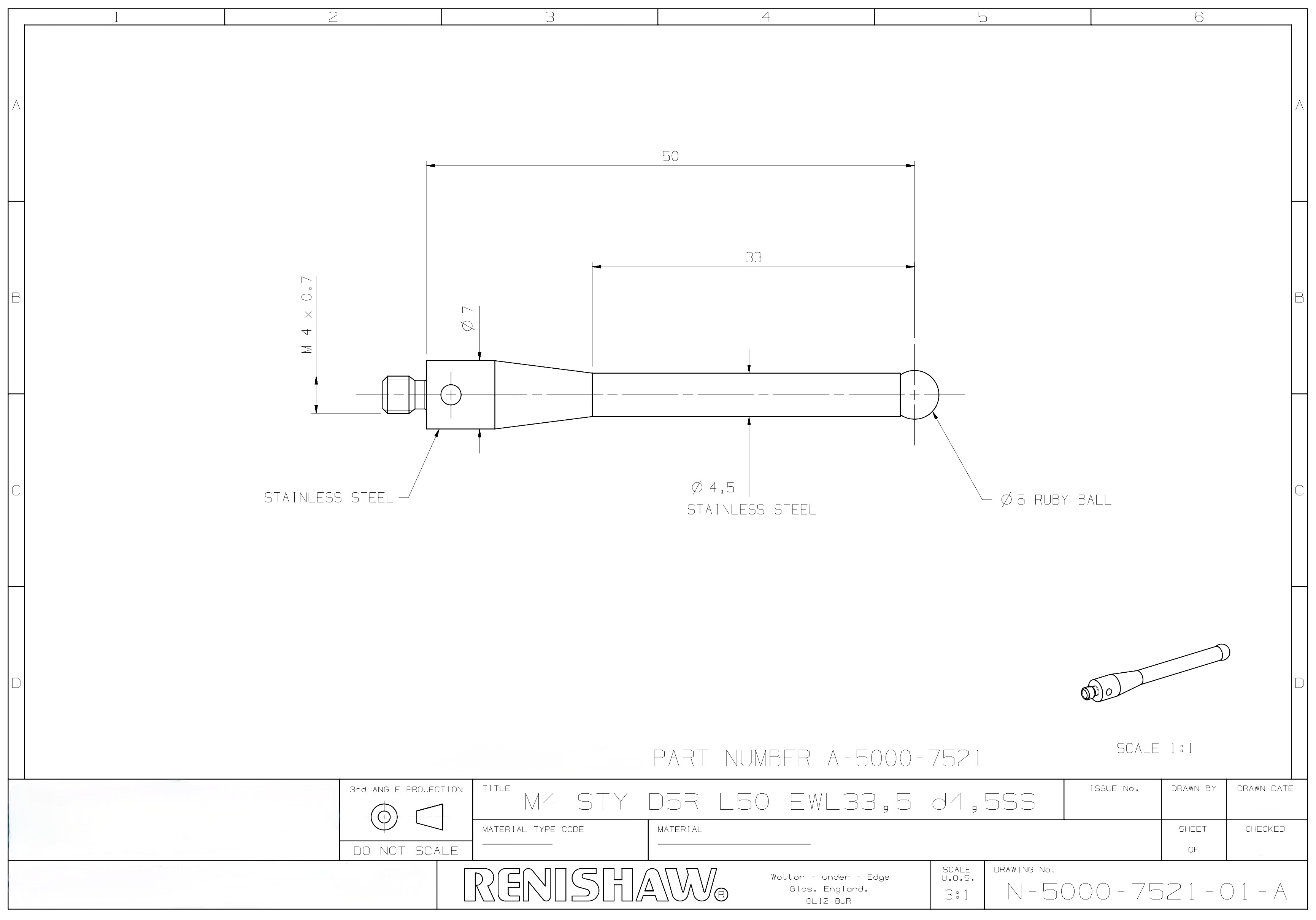 Renishaw M4 Ø5 mm Ruby Ball, Stainless Steel Stem, L 50 mm, EWL 33.5 mm Styli New with 1 Year Warranty.